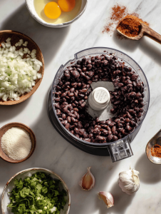 - Place the drained black beans in a food processor and pulse until roughly mashed, leaving some chunks for texture.