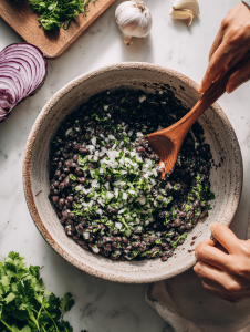 Step 2: Finely chop half an onion, a clove of garlic, and a handful of cilantro. Mix into the beans.