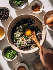 - Transfer the mashed beans to a mixing bowl and stir in the finely chopped onion, minced garlic, chopped cilantro, smoked paprika, soy sauce, and beaten egg until well combined.