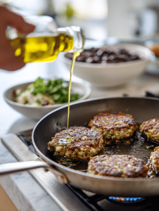 - Heat a non-stick skillet over medium heat and add a drizzle of vegetable oil. Once shimmering, carefully place the patties in the pan, leaving space between them.