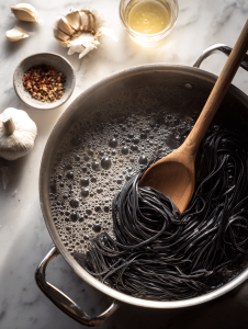 Step 2: Add the black pasta and cook for 8-10 minutes, stirring occasionally. Watch for the color to deepen and the pasta to become al dente.