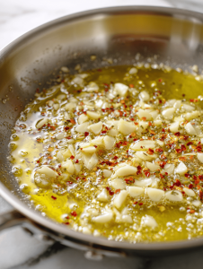 - Meanwhile, heat a tablespoon of olive oil in a deep skillet over medium heat. Add the finely chopped garlic and red pepper flakes, cooking for about 30 seconds until fragrant and just starting to turn golden.