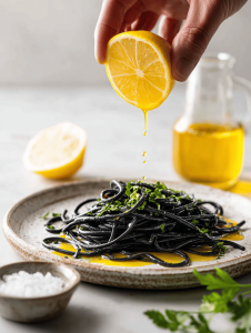 - Parsley and lemon: Brightens the dish instantly. Fresh parsley offers a herbal lift, lemon adds zing to cut through the ink’s richness.