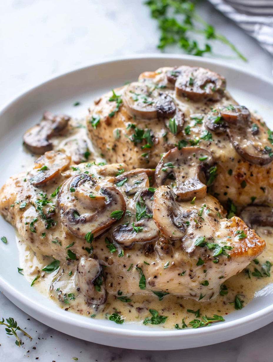 Creamy Mushroom Chicken is a comforting dish where tender chicken breasts are seared until golden, then simmered in a velvety sauce made from sautéed mushrooms, garlic, and fresh cream. The final dish boasts a rich, smooth sauce coating each piece of chicken, with tender mushrooms adding earthy texture and flavor. It’s perfect served over rice or with crusty bread for a cozy, satisfying meal.