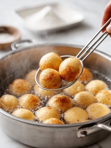 7. Drop a few dough balls into the boiling water at a time, cooking for about 30 seconds until they puff slightly and develop a shiny surface. Remove them with a slotted spoon and place on the prepared baking sheet.