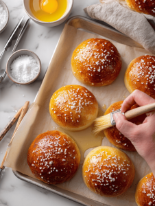 8. Repeat with all the dough balls, ensuring they’re evenly spaced on the baking sheet. Once all are boiled, brush the tops with a beaten egg for extra shine and sprinkle generously with coarse salt.