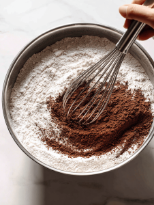 - In a large mixing bowl, whisk together the flour, baking powder, salt, and dark cocoa powder until evenly combined. This creates a rich, chocolatey dry mixture.