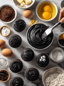- Frost each cooled cupcake with a generous swirl of the black icing, spreading evenly to cover the top surface.