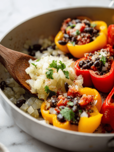 - Spoon the filling into each hollowed-out pepper, pressing down gently to fill completely. Arrange the stuffed peppers upright in a baking dish.