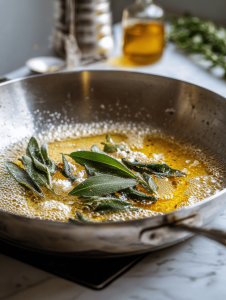 - In a skillet, melt the butter over medium heat. Add the chopped sage leaves and cook until the butter turns golden brown and aromatic, about 2-3 minutes. Remove from heat.