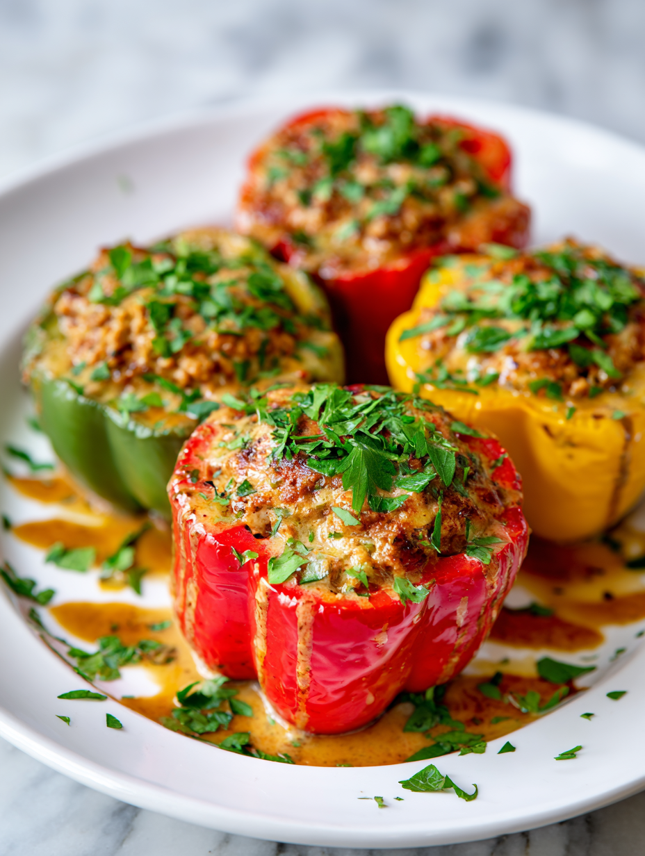 Let the stuffed peppers rest for 5 minutes to settle. Garnish with chopped herbs. Serve directly from the baking dish, allowing juices to redistribute for maximum flavor.