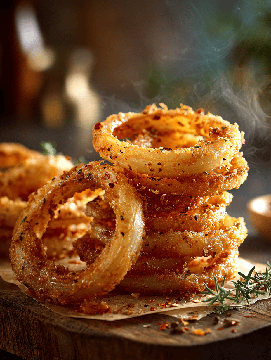 Crispy onion rings are made by dipping thick slices of onions into a seasoned batter and then frying until golden brown and crackling. The final result features a crunchy exterior that shells tender, sweet onions inside, delivering a satisfying balance of texture and flavor with smoky, savory notes.