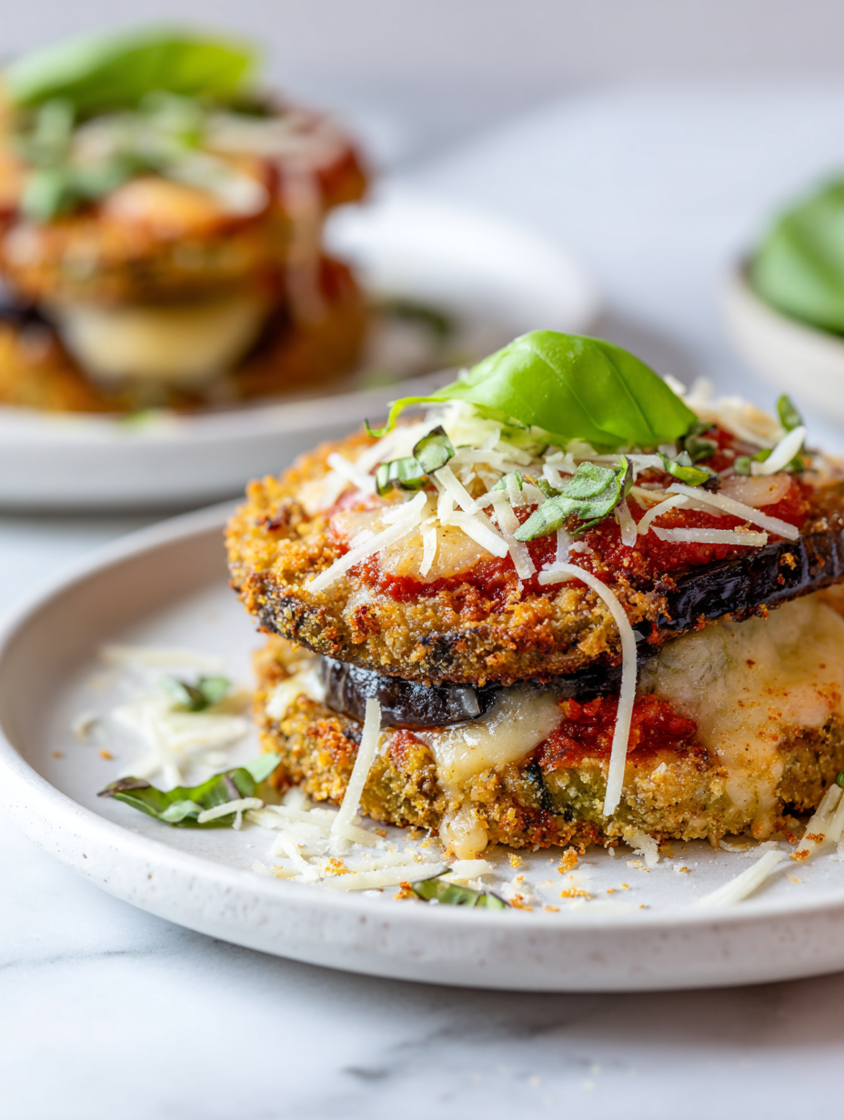 Let the baked eggplant Parmesan rest for 10 minutes outside the oven before slicing. This allows the layers to set, making it easier to serve clean slices. Plate with a sprinkle of fresh basil or a drizzle of olive oil if desired.