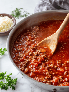 4. Simmer crushed tomatoes with the cooked meat mixture for 20 minutes, stirring occasionally. The sauce should thicken slightly and develop a rich, smoky aroma.