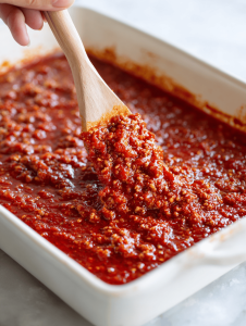 5. Spread a thin layer of the spicy tomato sauce in the bottom of your baking dish to prevent sticking.