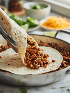 - Once the meat is ready, assemble each taco by placing a spoonful of meat on a warm tortilla.