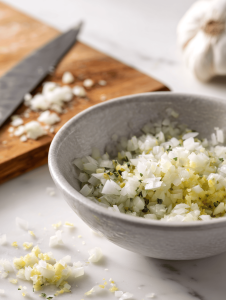 - Chop the onion finely and mince the garlic until fragrant and slightly softened.