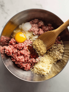Step 3: Mix ground meat with chopped veggies, breadcrumbs, an egg, and a splash of Worcestershire.
