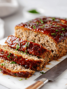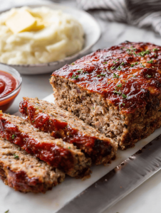 - Slice the meatloaf into thick, rustic pieces, revealing the juicy, slightly crumbly interior with a crisp top.