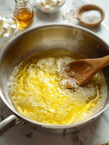- Melt the butter in a large saucepan over medium heat until it’s just bubbling and fragrant, about 2 minutes. You should hear a gentle sizzling and see the butter turn a light golden hue.