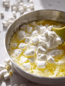 - Add the marshmallows to the melted butter and stir constantly with a rubber spatula until completely melted, glossy, and oozy, about 4 minutes. The mixture should be smooth and stretchy, releasing a sweet aroma.