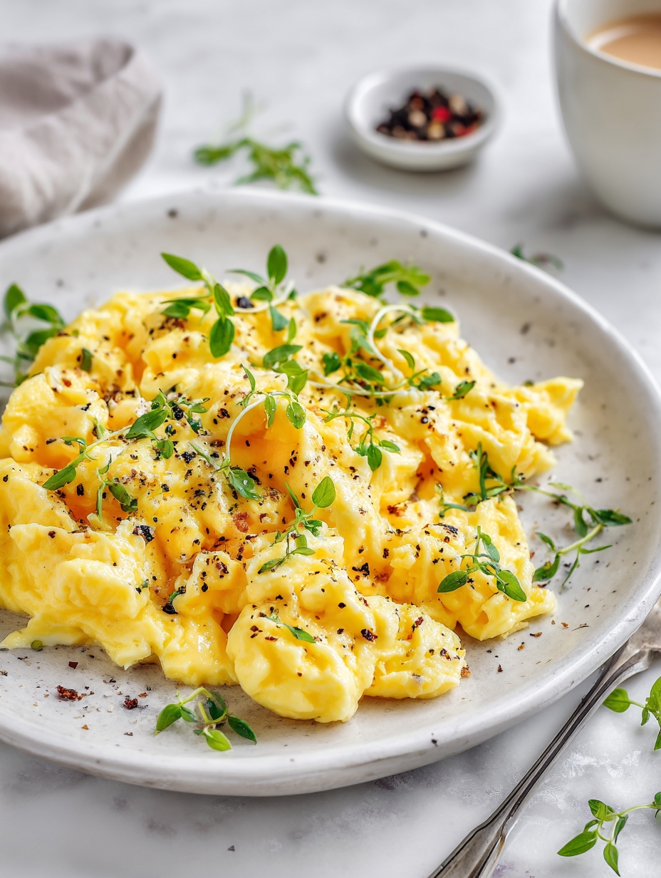 This recipe focuses on gently cooking eggs over low heat to achieve a luxuriously silky, custard-like texture. Main ingredients include fresh large eggs, butter, and optional cream, which contribute to their rich, tender consistency. The final appearance is soft, creamy, and slightly glossy, with a delicate, spoonable consistency perfect for a comforting breakfast.