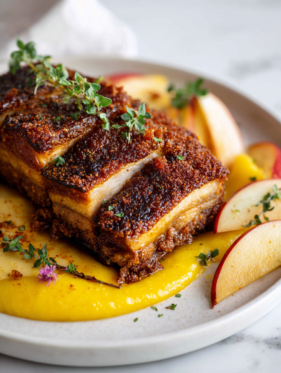 • This dish came about after a lazy weekend wandering through a farmers’ market, where I found the juiciest apples and a piece of pork belly that looked almost too good to resist. I wanted to create something that felt both nostalgic and fresh, a bit like those Sunday family feasts but with a modern twist. The idea of combining crispy, fatty pork with a bright, slightly sweet apple puree just clicked in that moment.