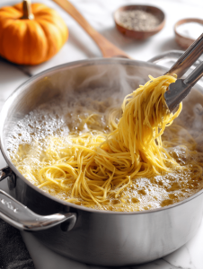 Step 2: While pumpkin roasts, cook your pasta. Use a large pot of salted water, boil until al dente, about 8-10 minutes.
