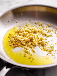 4. In a skillet or saucepan, heat a tablespoon of olive oil over medium heat. Add the minced garlic and cook until fragrant, about 30 seconds, until it begins to turn golden and releases a warm aroma.