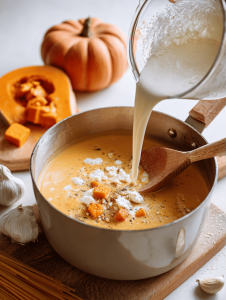 Step 3: Make the sauce. In a pan, melt butter, add minced garlic, cook until fragrant, then stir in pumpkin puree, cream, and a pinch of nutmeg.
