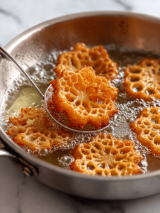 8. Carefully lift each web shape with a spatula or your hands, then gently lower it into the hot oil, listening for the satisfying sizzle.
