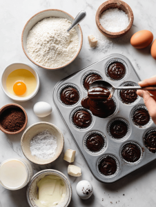 - Preheat your oven to 180°C (350°F) and line a muffin tin with dark-colored paper liners for a spooky vibe.