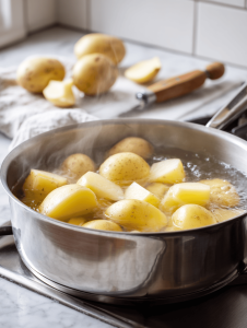 - Peel and chop the potatoes into even chunks, then boil them in salted water until tender, about 15 minutes. The water should be bubbling gently and the potatoes should feel soft when pierced with a fork.