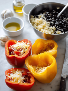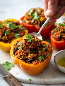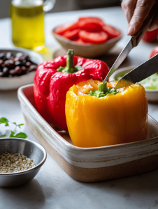 - Spoon the filling into each hollowed-out pepper, pressing down gently to fill completely. Arrange the stuffed peppers upright in a baking dish.
