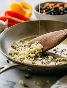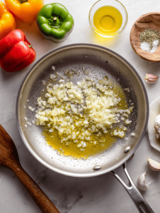 - Heat olive oil in a skillet over medium heat and add diced onion, cooking until translucent and fragrant, about 5 minutes. Add minced garlic and cook for another minute until aromatic.
