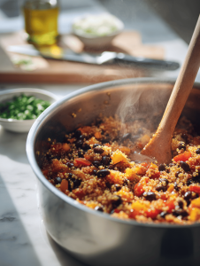 Step 5: Stir in cooked quinoa, black beans, chopped tomatoes, and chili powder. Cook until heated through, about 3 minutes.