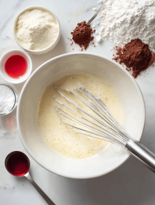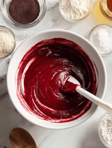 - Add the gel food coloring—about 2 tablespoons—and mix thoroughly, creating a deep, blood-red hue throughout the batter. The color should be vibrant and uniform.