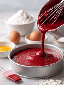 Step 5: Add a vibrant red gel food coloring—about 2 tablespoons—to the batter. Mix thoroughly until the color is evenly distributed and the batter is a deep, bloody hue.