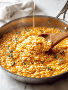 This pumpkin risotto is a creamy, comforting dish that combines tender arborio rice with sweet, earthy pumpkin. It’s made through slow, gentle stirring and simmering, resulting in a velvety texture with a vibrant orange hue. The dish is finished with Parmesan and herbs, offering a warm, satisfying bite perfect for cozy evenings.