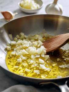 2. Heat a splash of olive oil and a tablespoon of butter in a wide pan over medium heat until shimmering. Add the chopped onion and cook until translucent and fragrant, about 5 minutes.