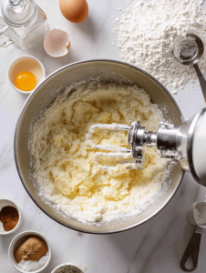 Step 1: Start by mixing softened butter and sugar until fluffy, about 3 minutes on medium speed.