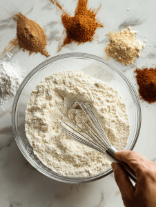 - In a separate bowl, whisk together the flour, baking powder, cinnamon, nutmeg, and cloves to evenly distribute the spices.