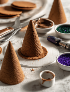- Shape the cookies or wafers into cones resembling witch hats. If needed, gently cut or re-shape with a sharp knife to get a pointed tip.